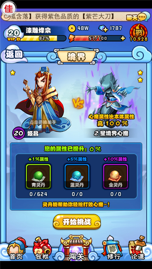 等级10第一次,20一次类推。挑战心魔需要(天材地宝),游戏每章节星级奖励都有,提醒!挑战心魔境界时最好卸下法宝,这样心魔的实力没那么高。